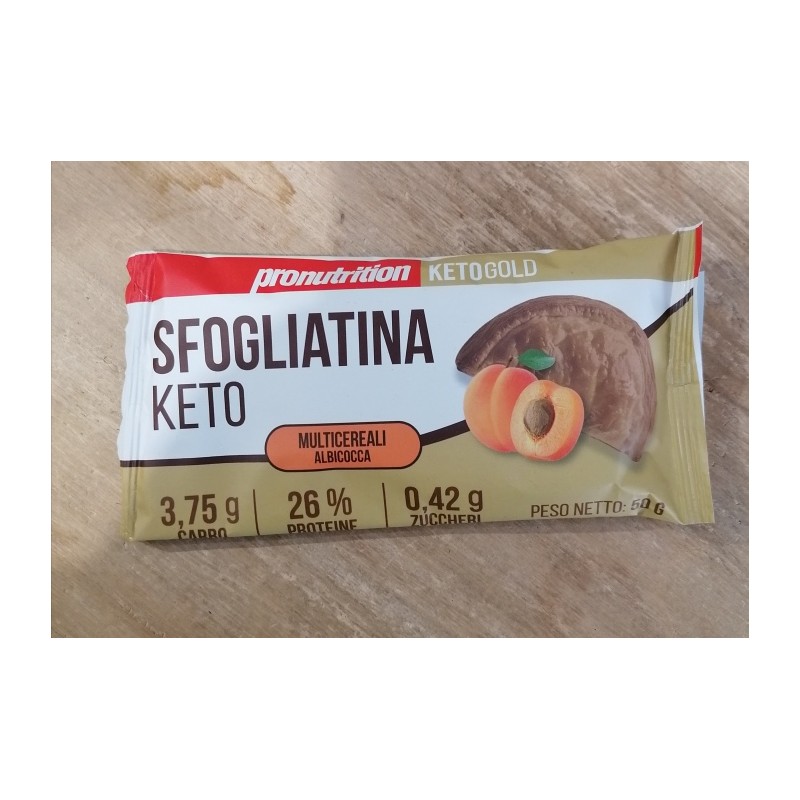 La Sfogliatina Multicereali Albicocca 50g di Pro Nutrition è uno snack che combina una base di sfoglia multicereali con una crema all'albicocca, senza zuccheri aggiunti e 100% Keto Friendly.